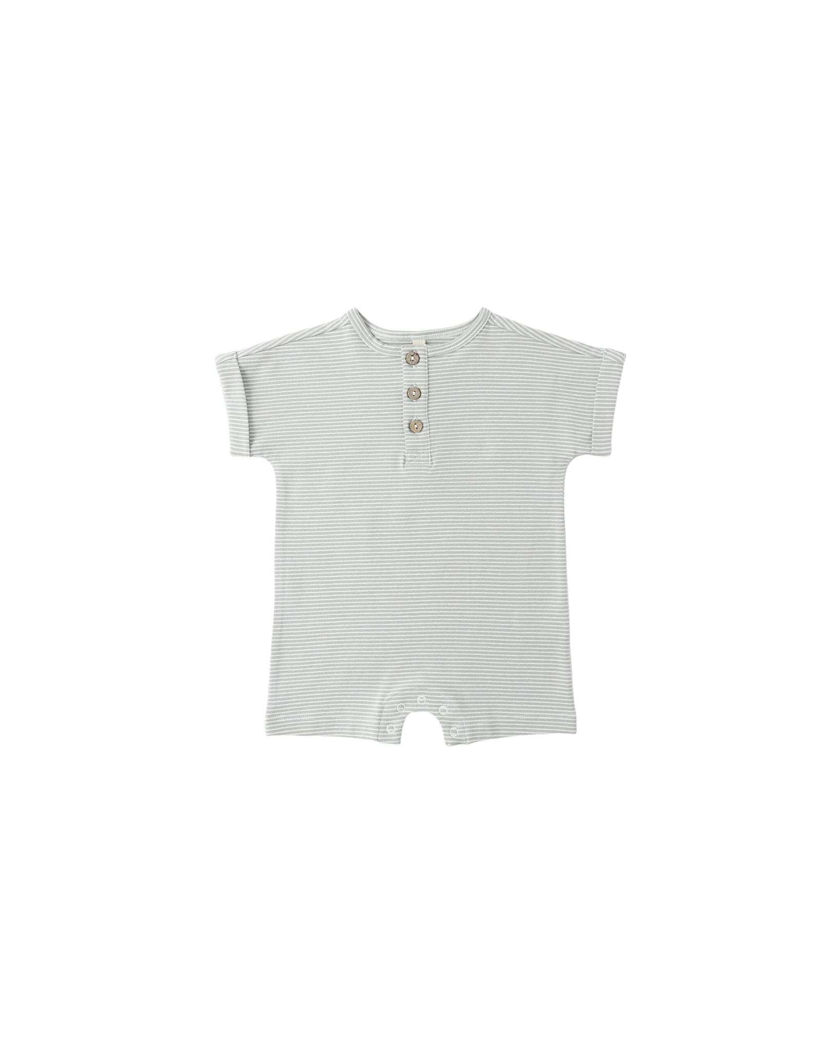 Our short-sleeve romper has folded cuffed sleeves, buttons down the chest, and snaps along inseam for easy changes - the perfect lightweight summer staple!